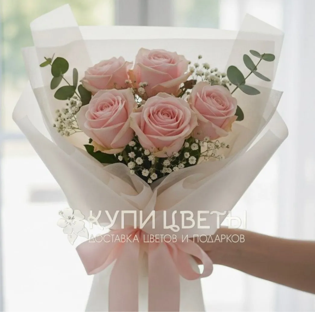 Розовые розы-5 шт., гипсофила, зелень, упаковка, лента |