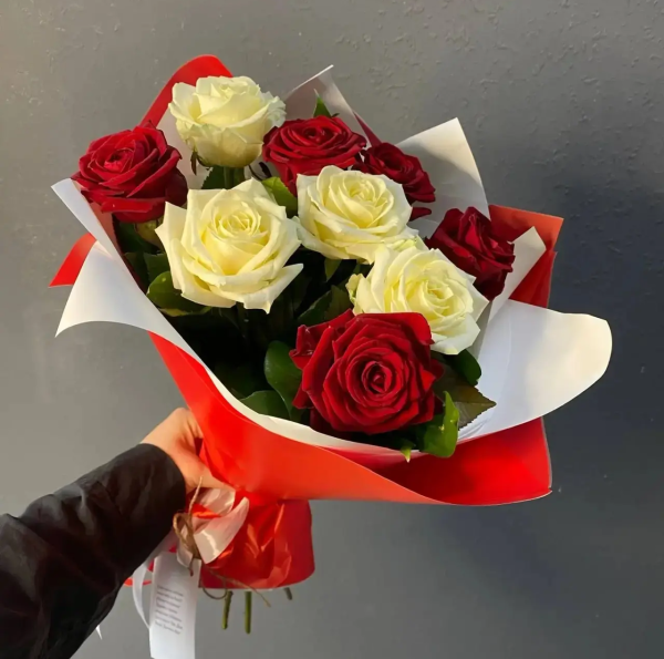 Изысканное сочетание страсти и нежности - букет из красных и белых роз станет идеальным подарком для любого повода. Глубокий алый цвет символизирует любовь и восхищение, а белые розы добавляют нотки чистоты и искренности. Гармонично оформленный в современной упаковке, этот букет выглядит утончённо и презентабельно.