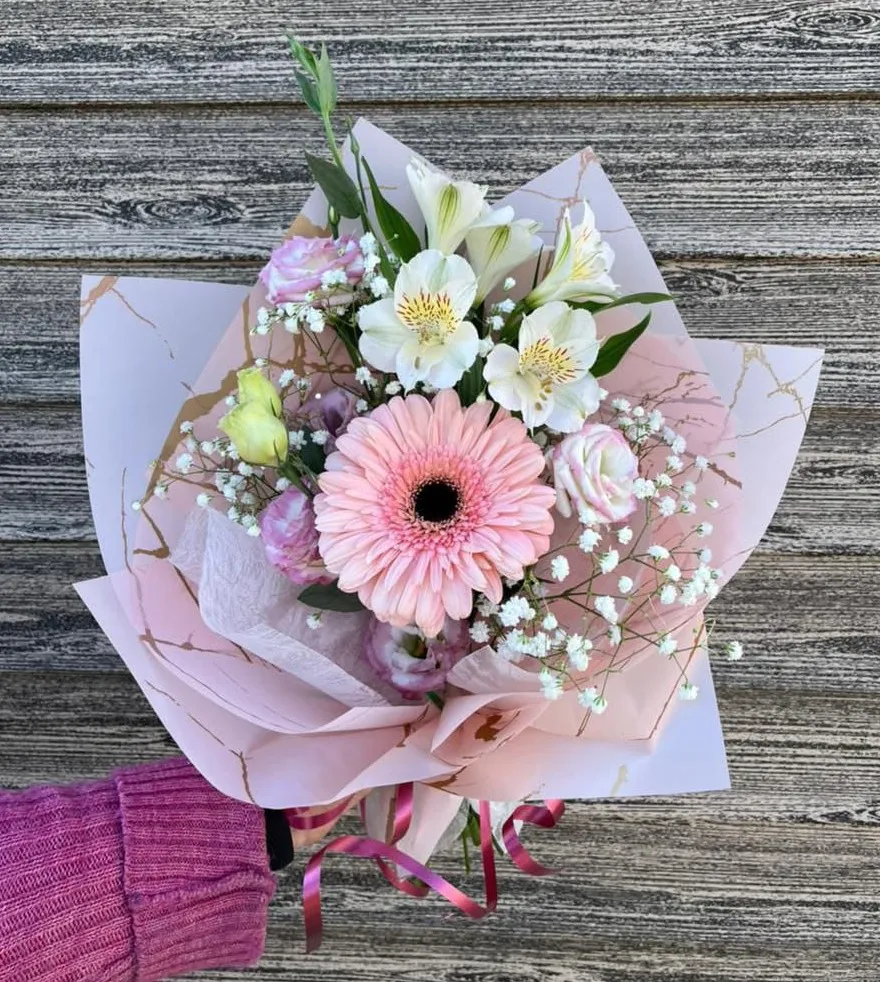 Объединенные вместе, герберы, альстромерии, гипсофила и эустома создают великолепное зрелище, которое привлекает внимание и вызывает восхищение. Такой букет станет идеальным подарком для любого случая — будь то день рождения, юбилей или просто знак внимания, способный донести искренние чувства и радость общения.