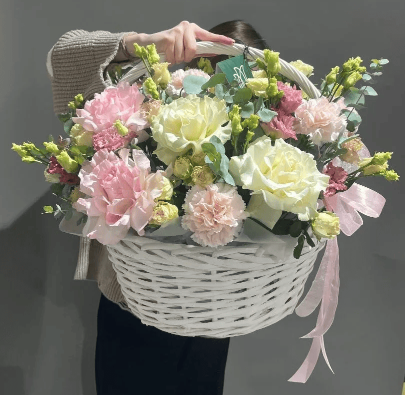 Эустома, с её тонкими, словно кружевными лепестками, украшают композицию, привнося мягкость и изящество. А эвкалипт, с его зелёными листочками и характерным ароматом, добавляет завершенность, придавая общей картине свежесть и природное очарование.