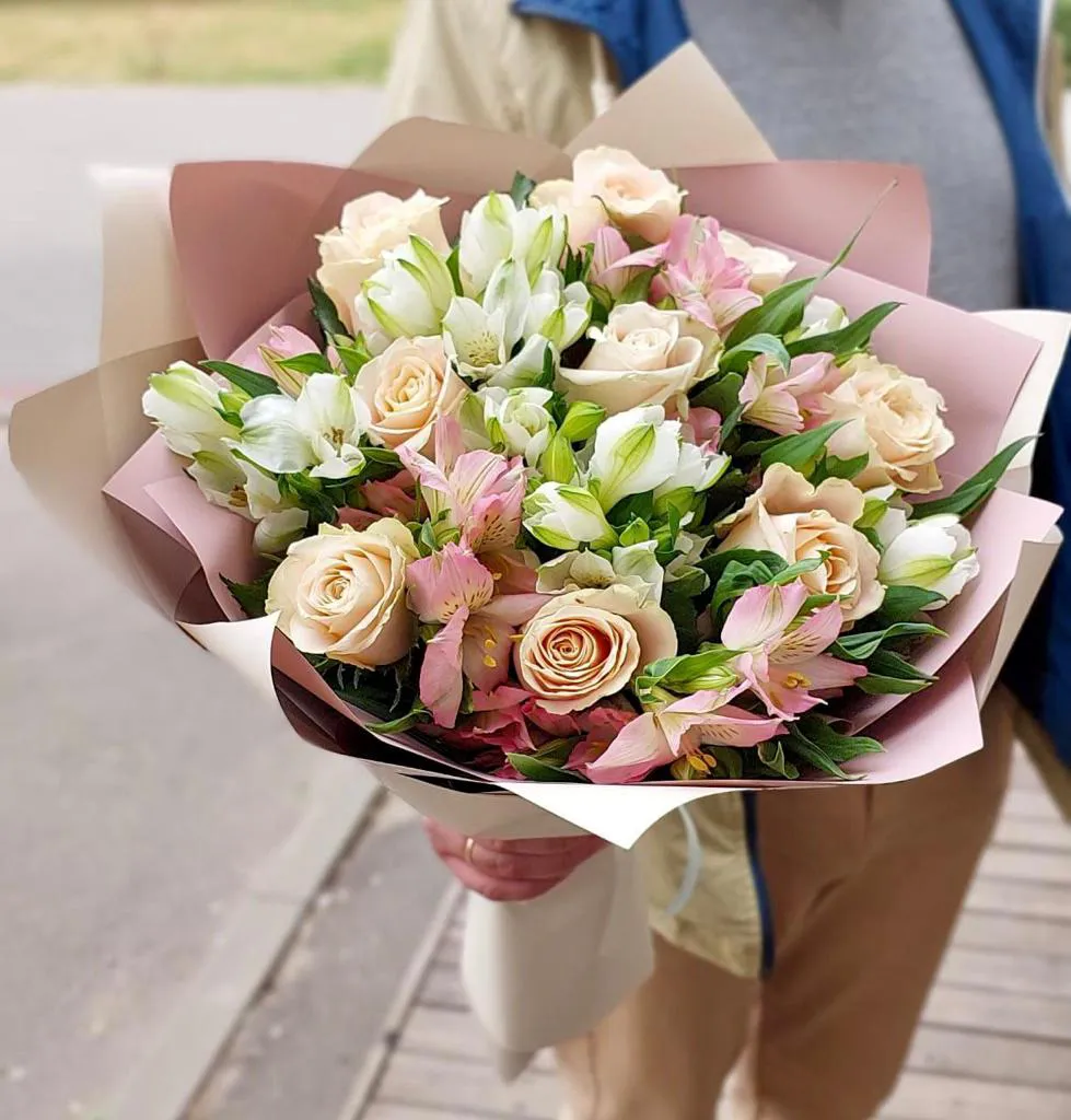 - Стандарт - роза - 5 шт., альстромерия - 5 шт., зелень, упаковка, лента