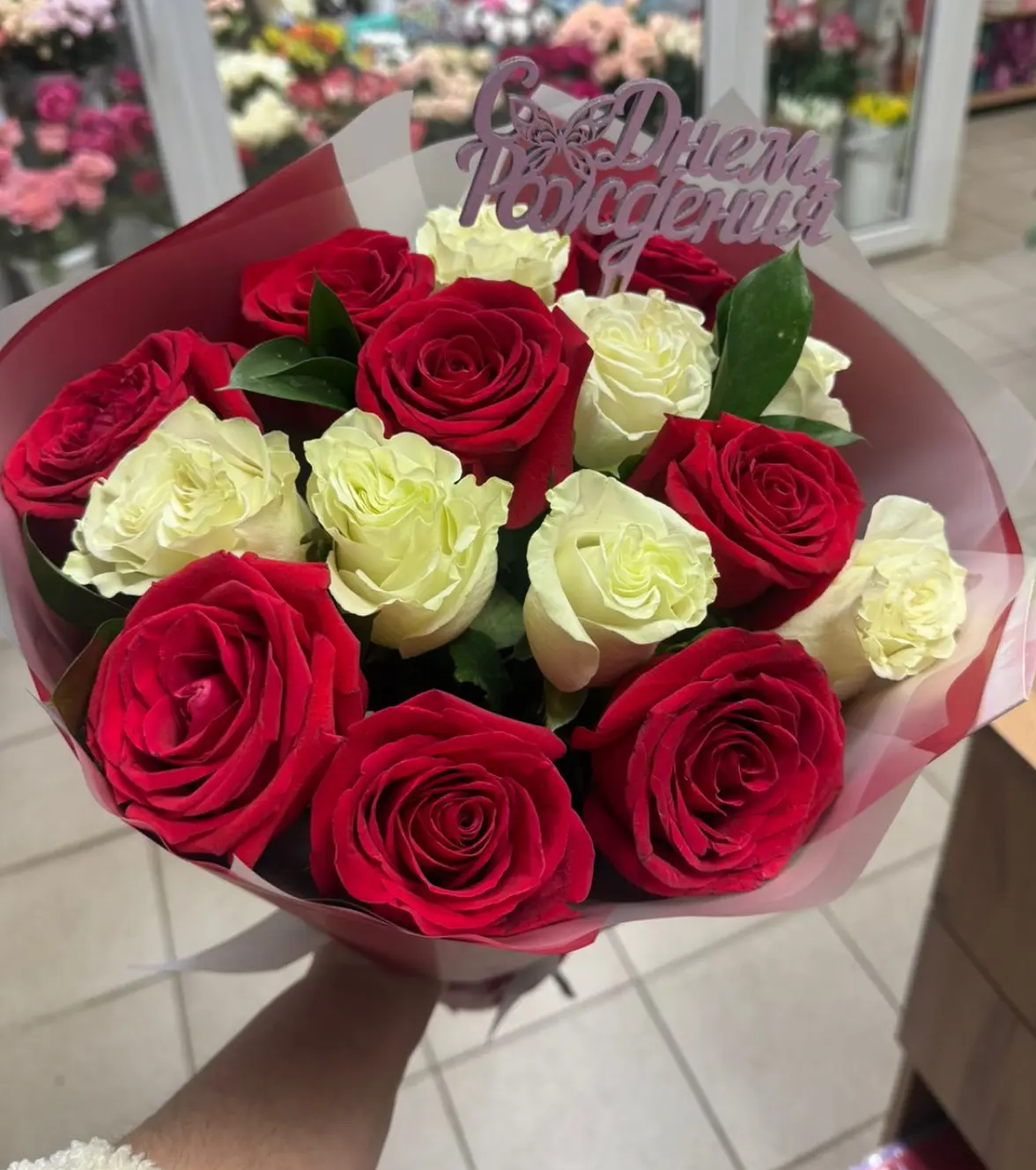 Состав букета: красные и белые розы, зелень,топпер,упаковка,лента