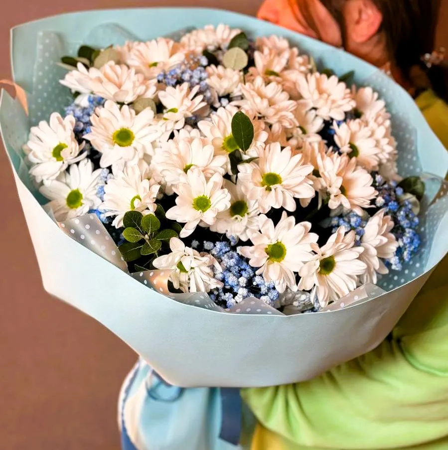Кустовая хризантема ,гипсофила, упаковка,лента |