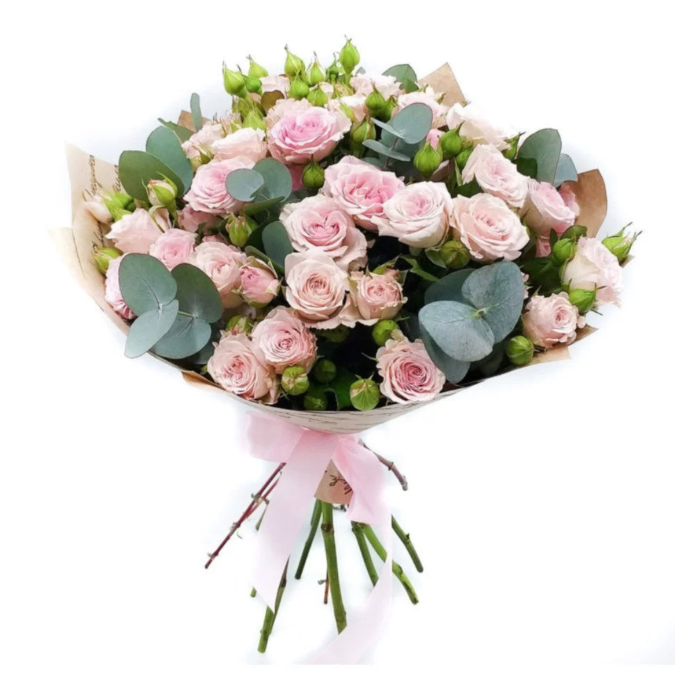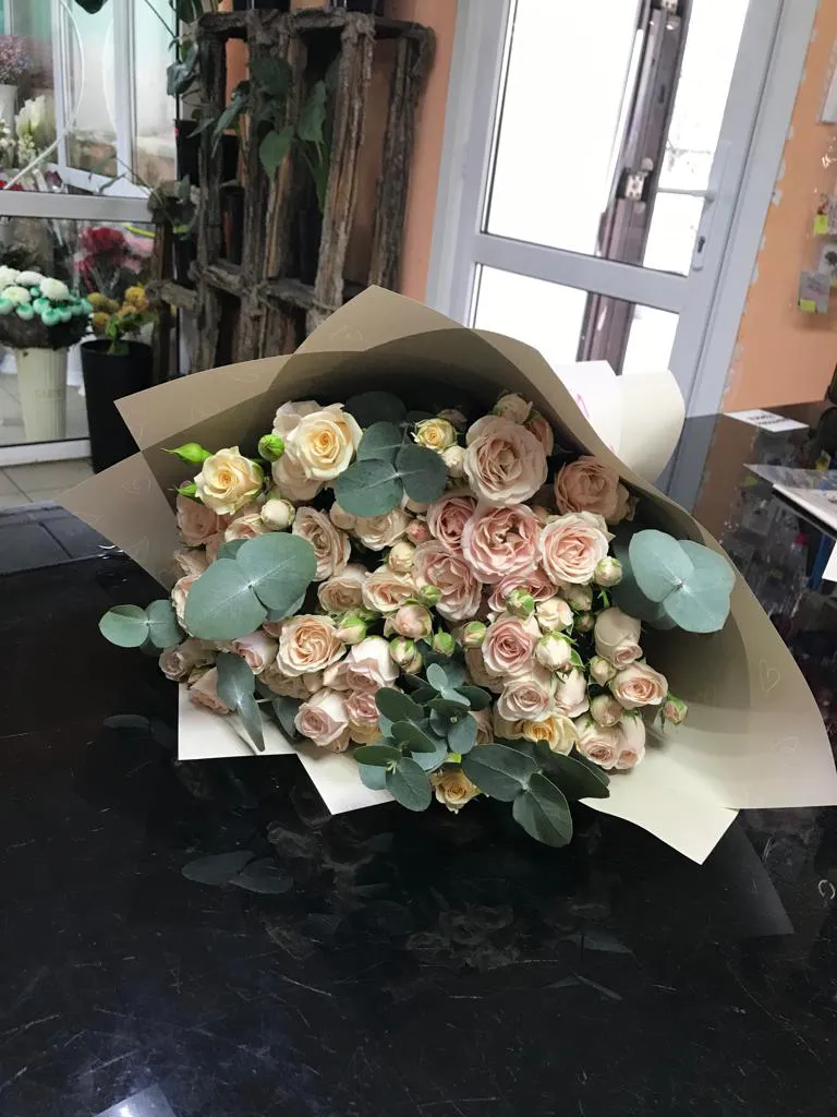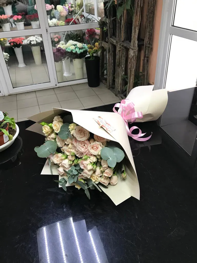 Кустовые розы, зелень, упаковка,лента |