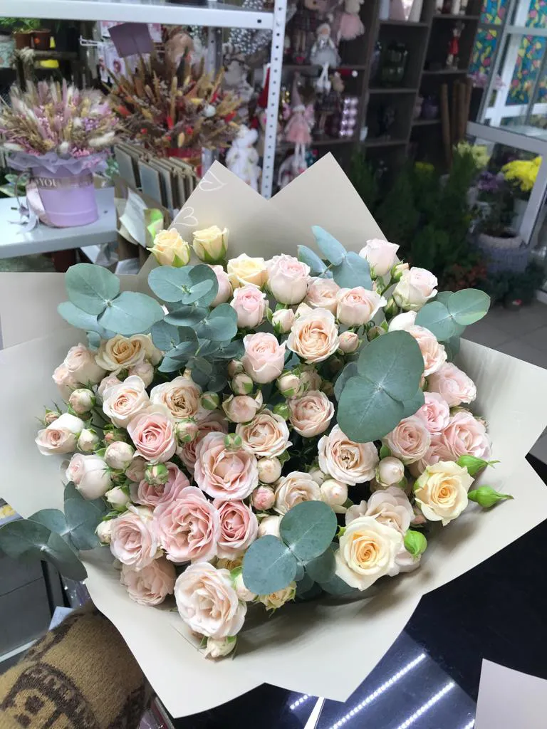 - Средний - кустовая роза - 7 шт., зелень, упаковка, лента