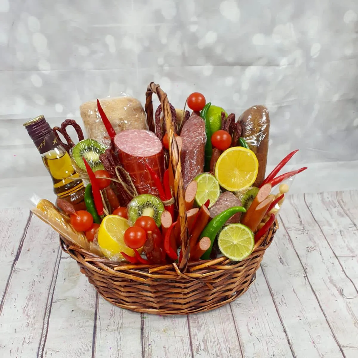 Состав: колбаса, хлеб, сыр, перец, огурцы, черри, лимоны, киви, колбаски ,корзина. |