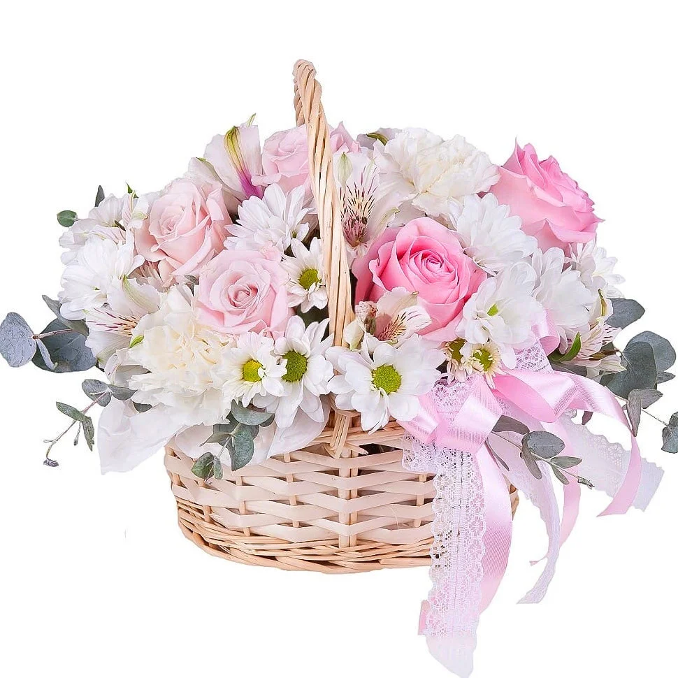 - Состав: роза - 7 шт., гвоздика - 3 шт., альстромерия - 3 шт., кустовая хризантема - 3 шт., зелень, оазис, корзина.