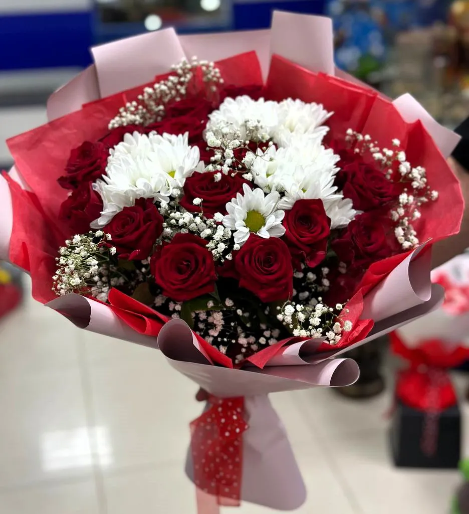 - Средний - розы 11 шт, хризантема 2шт, гипсофила, упаковка, лента