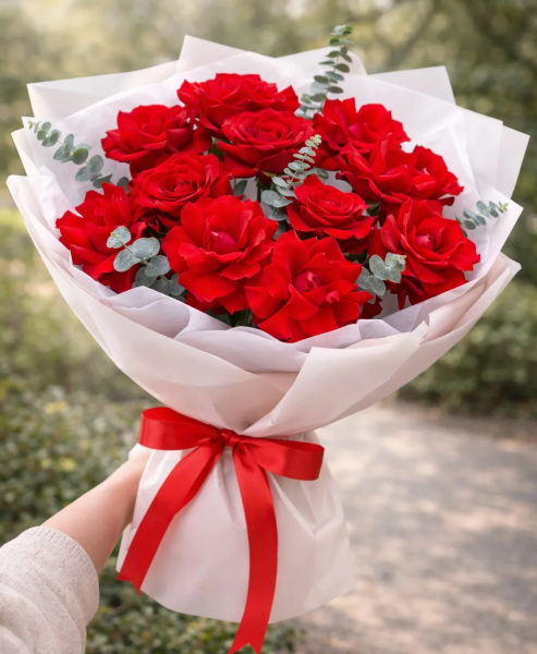 Изысканный букет французских красных роз с эвкалиптом в элегантной упаковке - это воплощение страсти, утончённости и безупречного вкуса. Премиальные розы с плотными бархатными бутонами отличаются насыщенным цветом и благородным видом, создавая эффект дорогого, выразительного подарка.