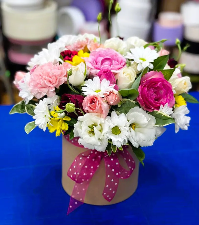 Ромашковая хризантема, эустома, гвоздика, кустовые розы, зелень, коробка, лента |