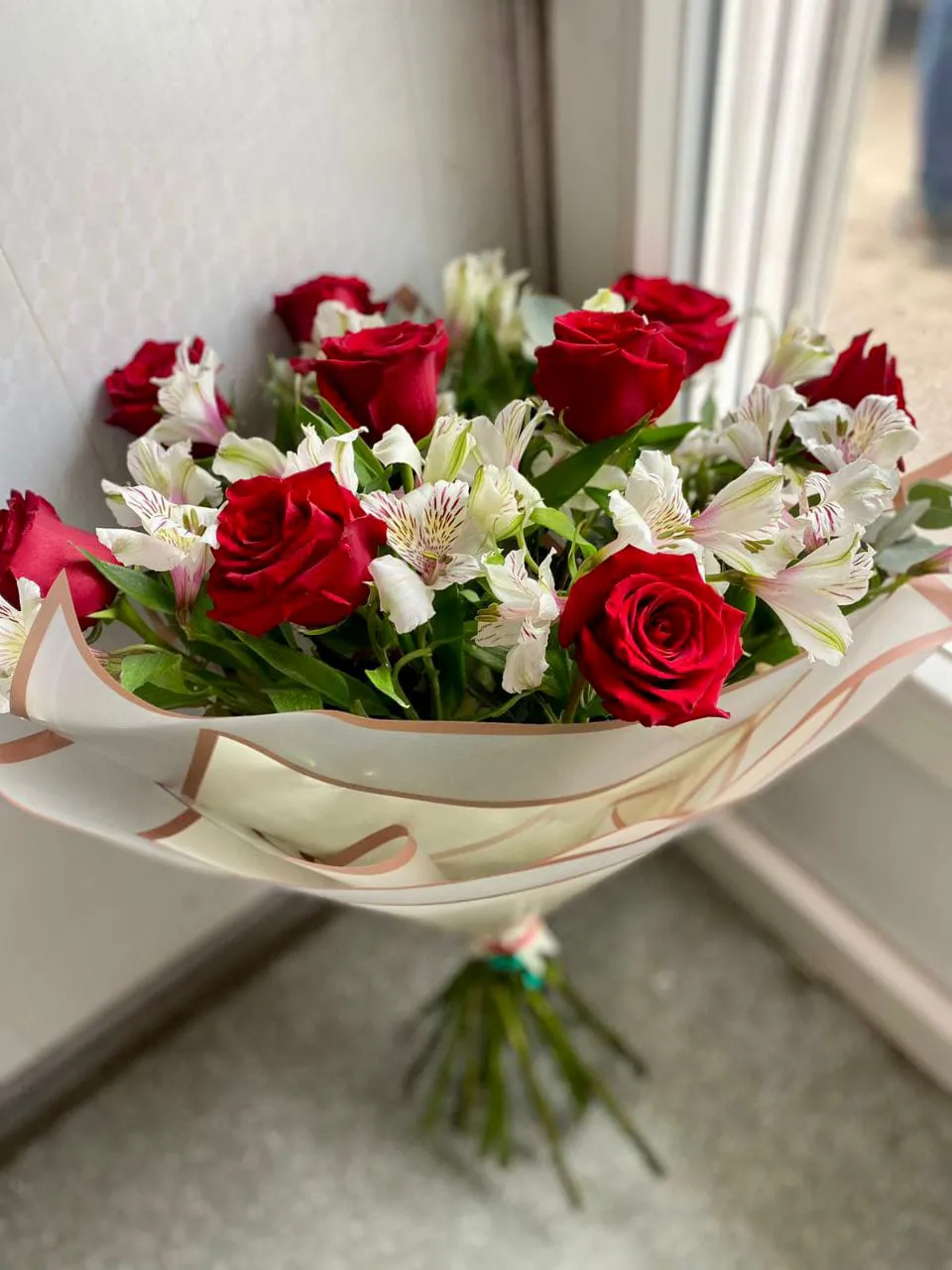 - Стандартм - роза - 3 шт., альстромерия - 4шт. зелень, упаковка, лент