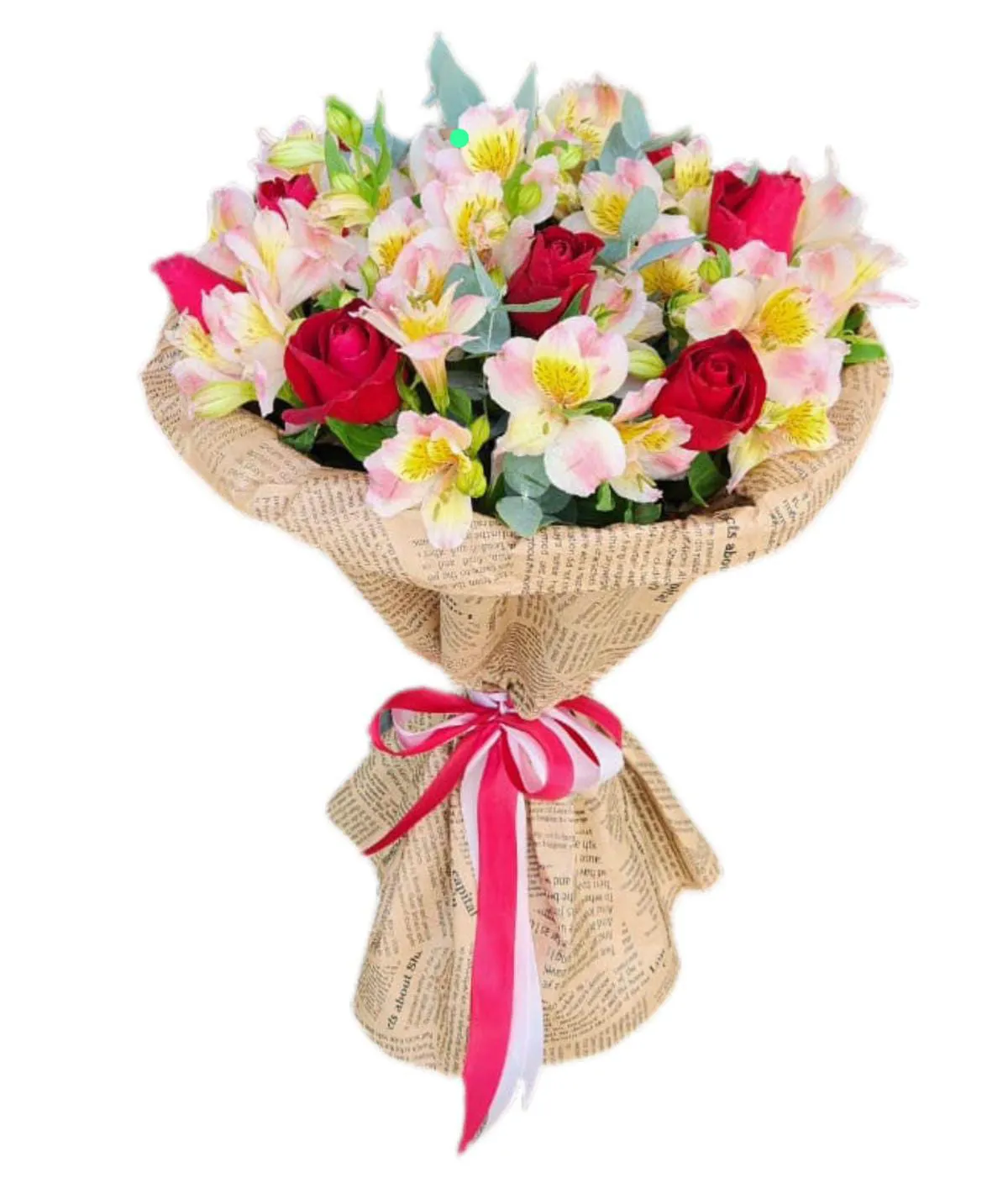 - Средний - роза - 5 шт., альстромерия - 5 шт. зелень, упаковка, лента