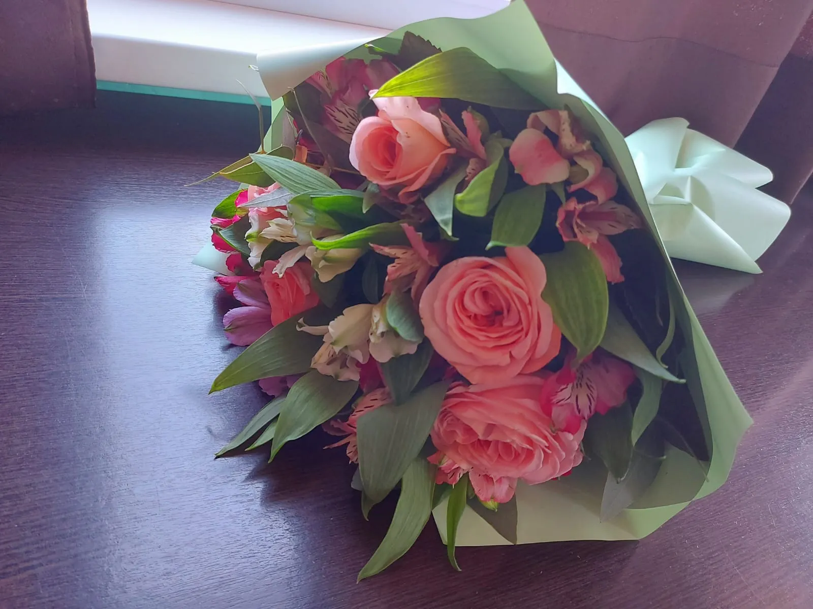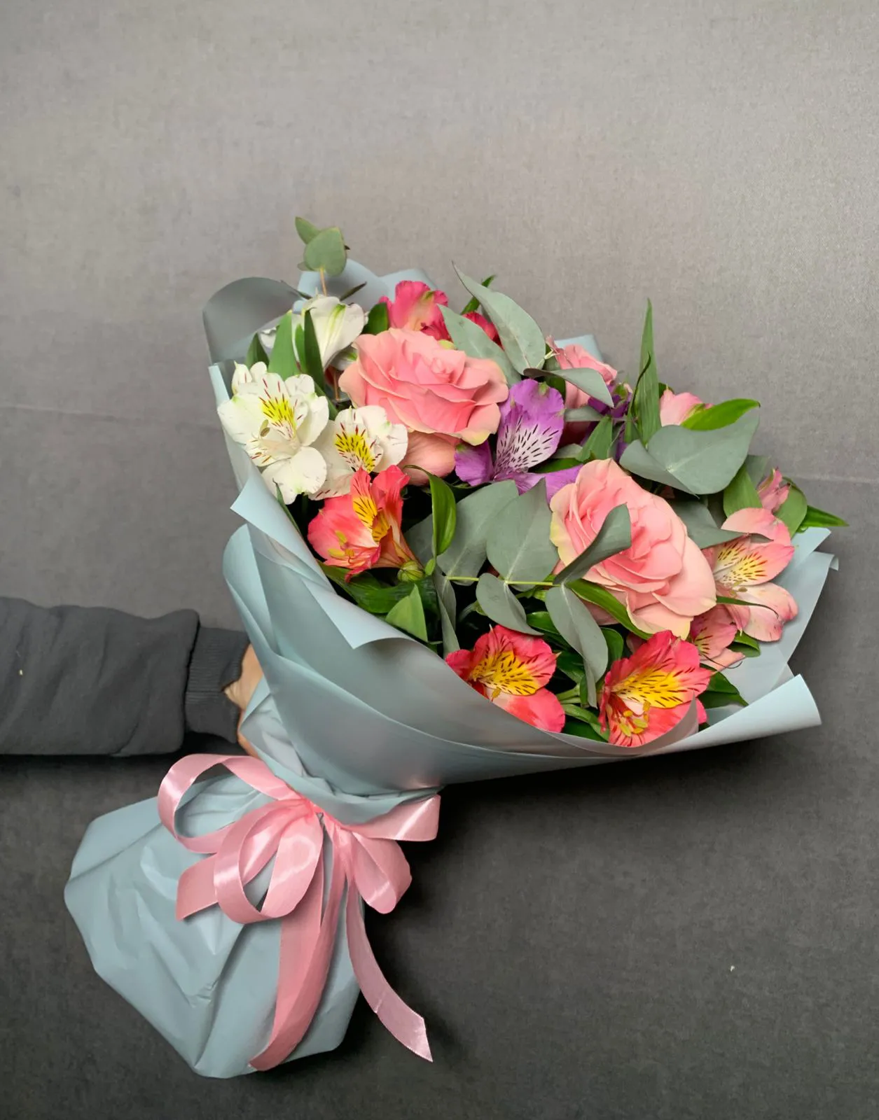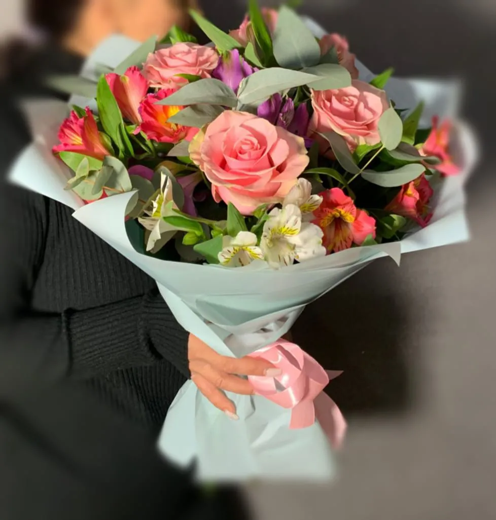 Розы,альстромерии,зелень,упаковка,лента |