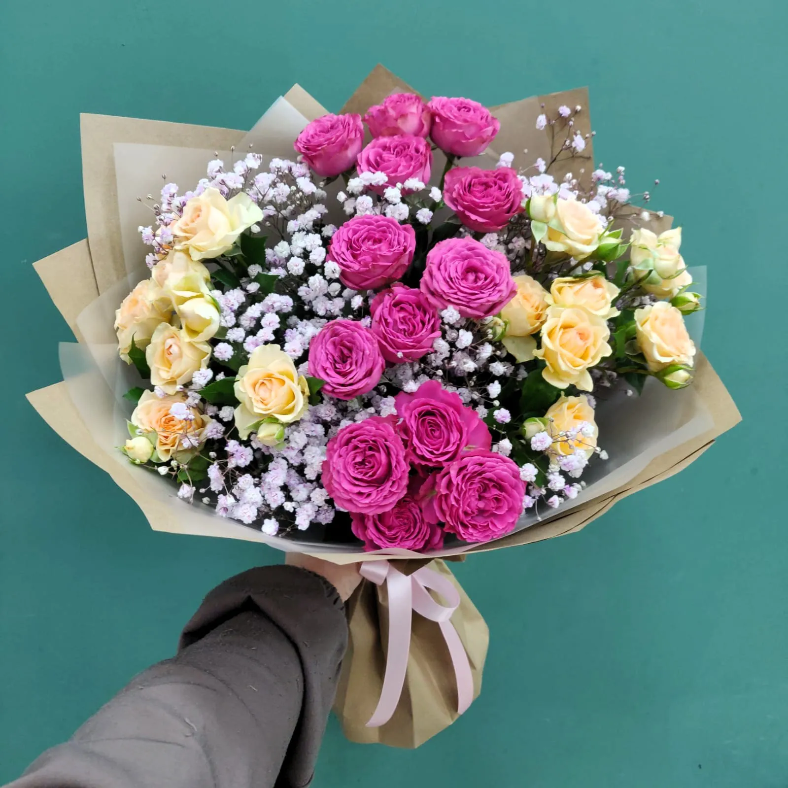 - Экстра - роза кустовая - 15 шт., гипсофила, упаковка, лента