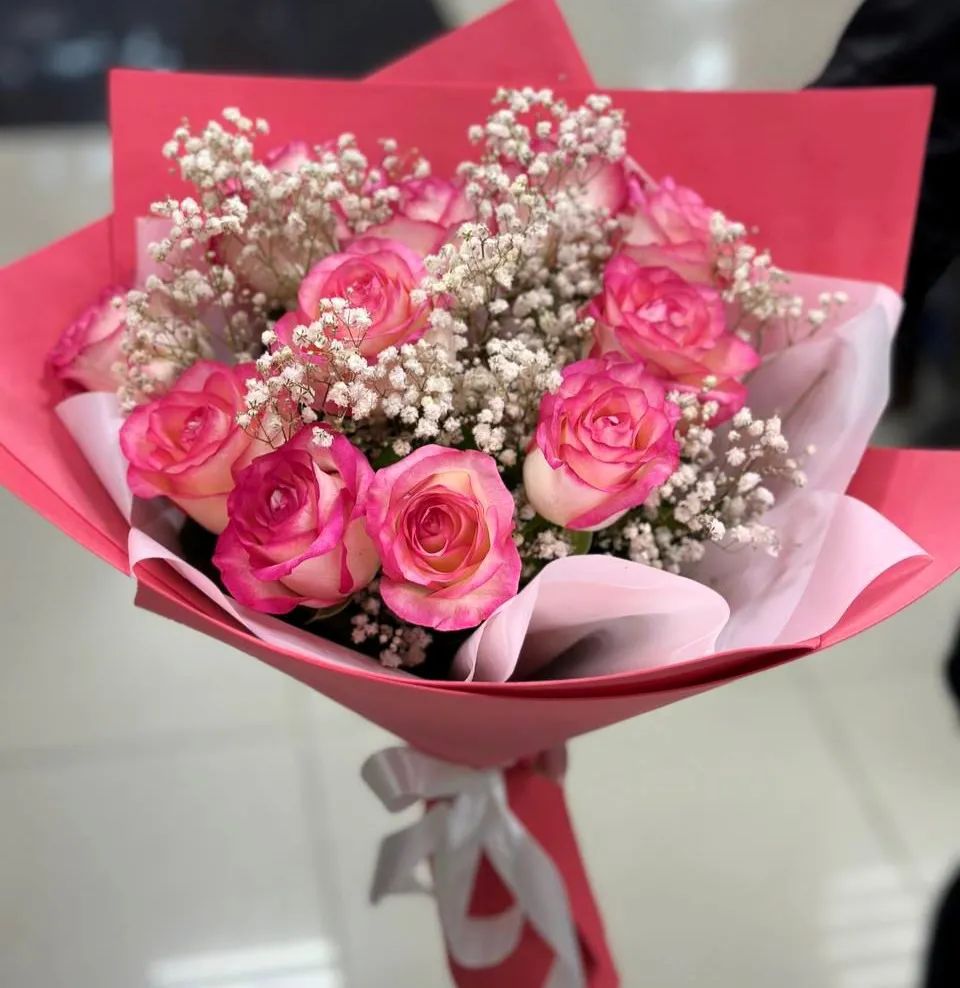- Средний - роза - 9 шт., гипсофила, упаковка, лента