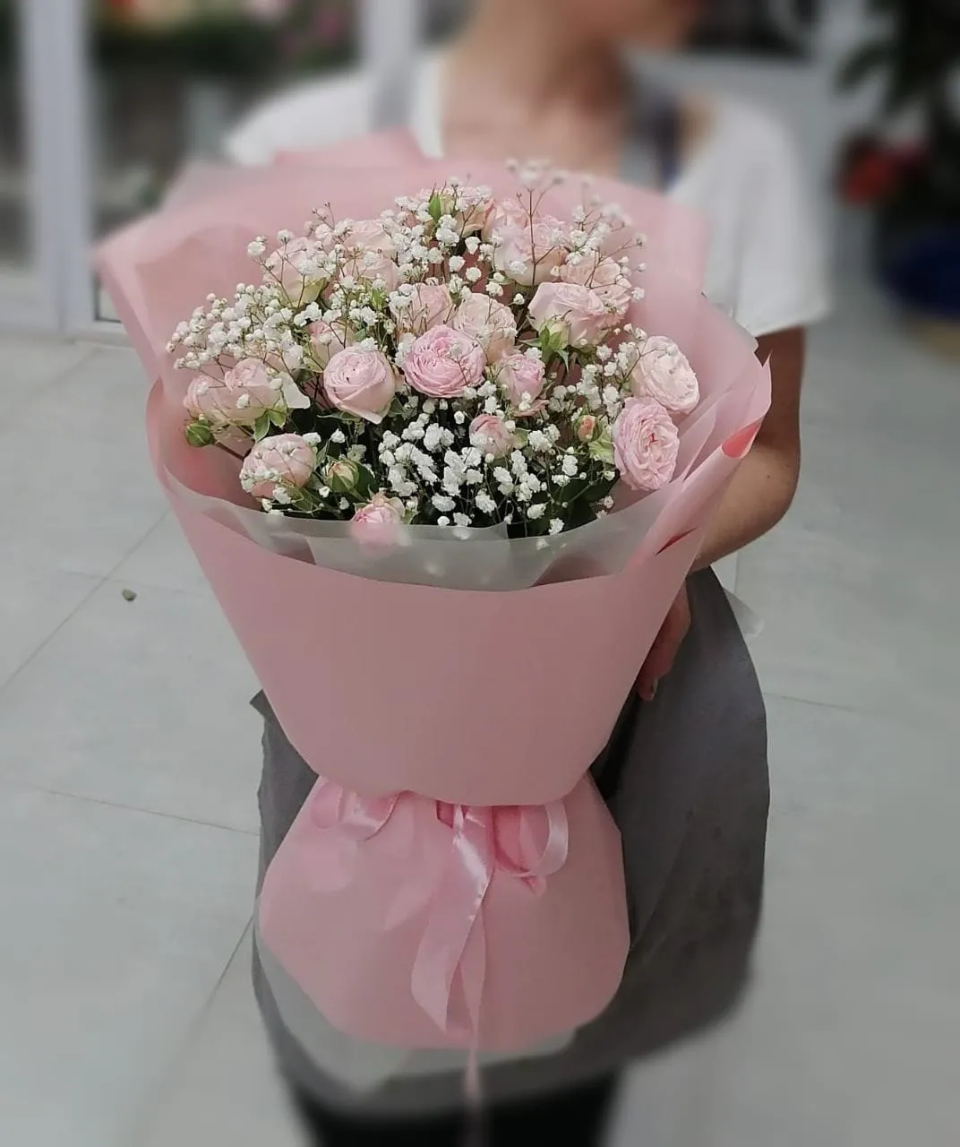 - Экстра - роза кустовая - 15 шт., гипсофила, упаковка, лента