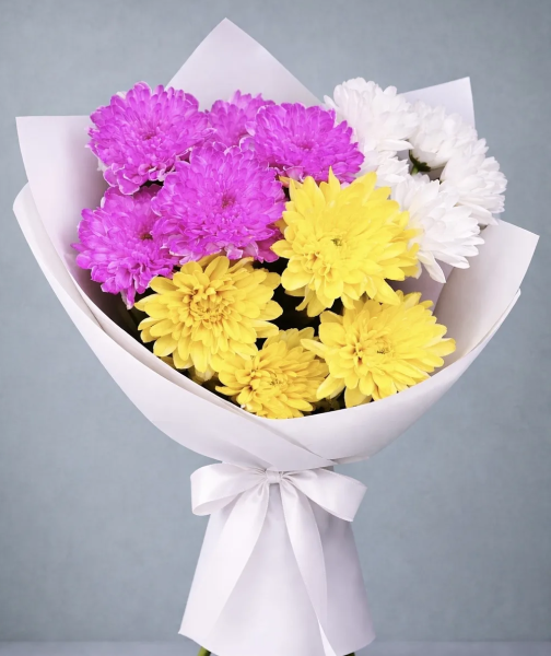 Нежный и гармоничный букет, в котором белые, жёлтые и розовые кустовые хризантемы создают мягкое сочетание оттенков и лёгкое, радостное настроение. Пышные соцветия придают композиции воздушность и объём, наполняя её свежестью и уютом.