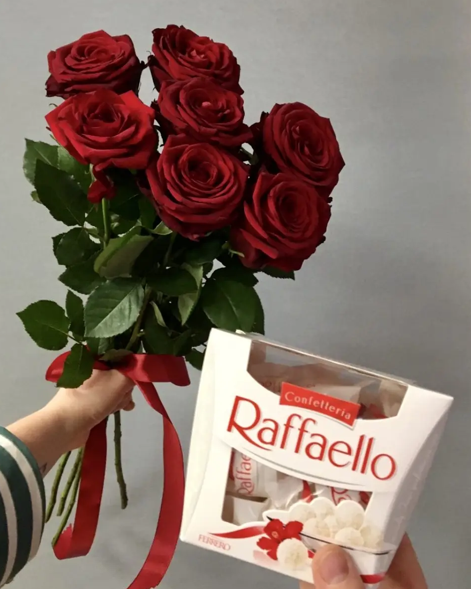 Букет из 7 красных роз с лентой и конфетами Raffaello - идеальный подарок с любовью.