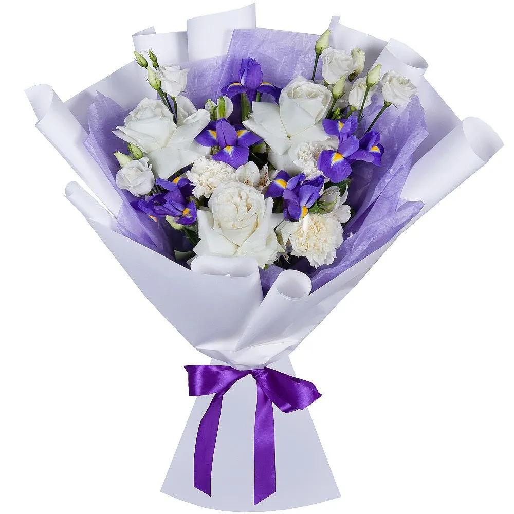 - Стандарт - ирис - 5 шт, роза - 3 шт, эустома - 1 шт, альстромерия - 2 шт, гвоздика - 3 шт, упаковка, лента