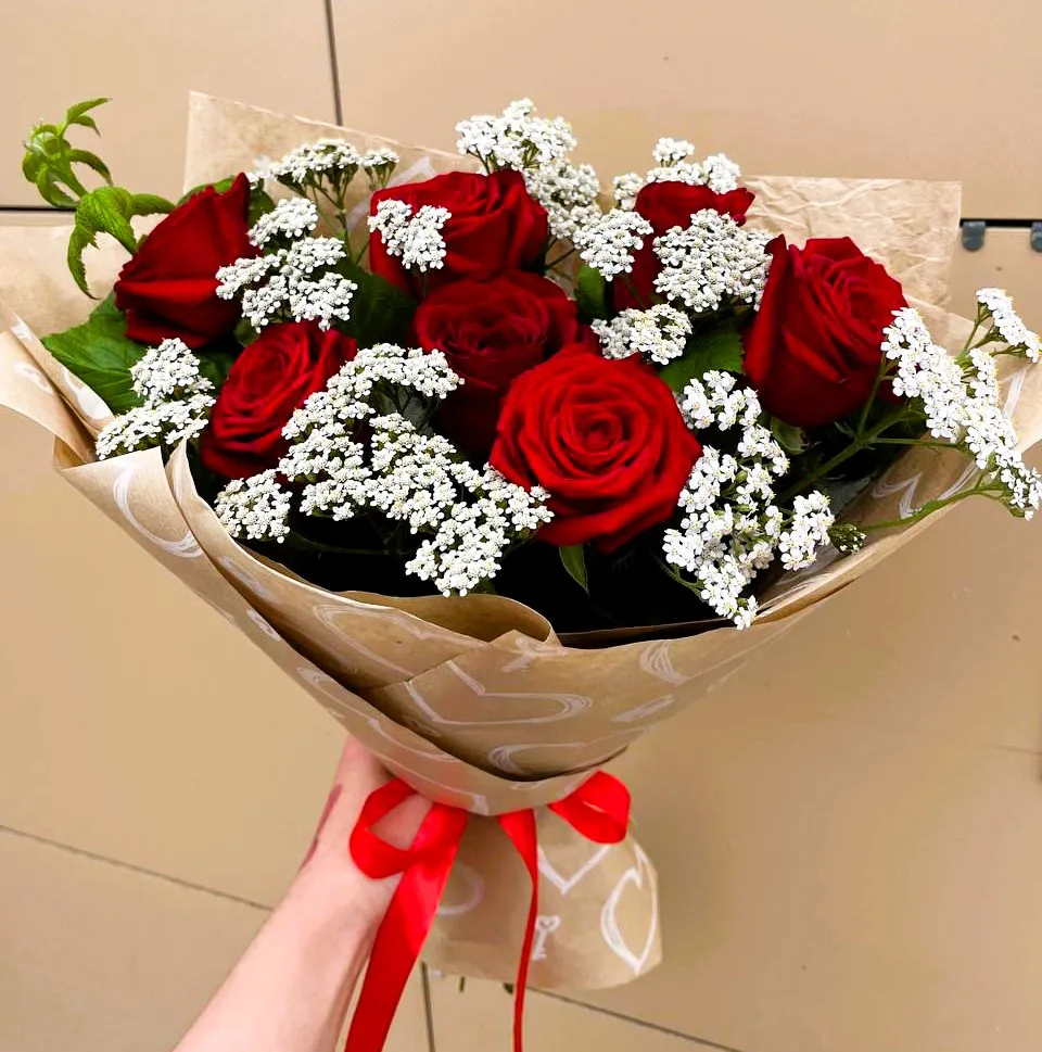 - Средний - роза - 11 шт, зелень, упаковка, лента