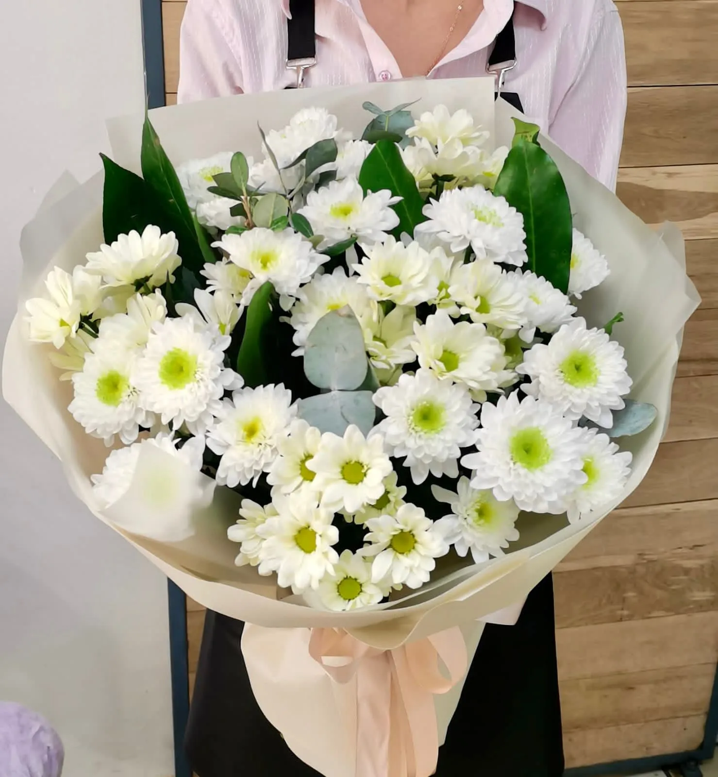 - Стандарт - кустовая хризантема - 5 шт., упаковка, лента