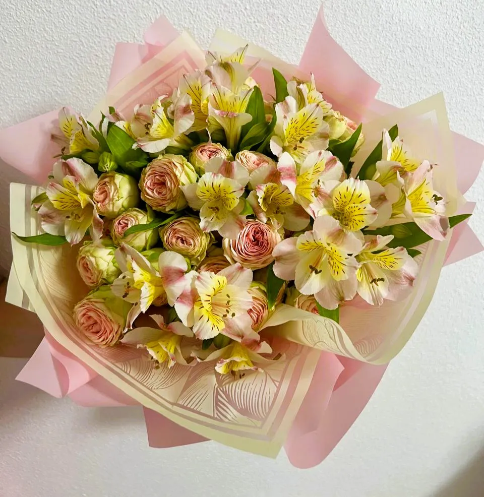 - Средний - кустовая роза - 5 шт., альстромерия - 7 шт.,упаковка,лента