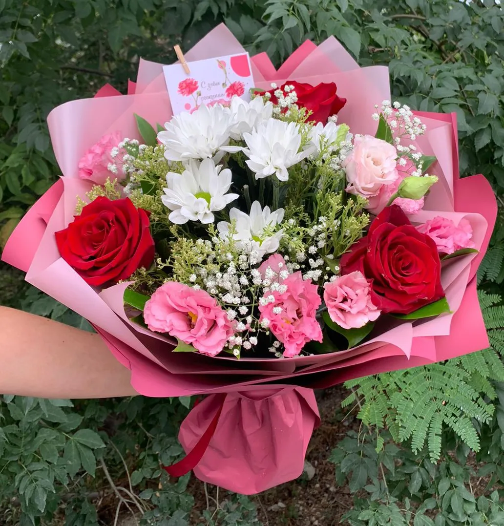 - Средний - роза - 5 шт., Эустома - 3 шт., хризантема - 2 шт., гипсофила, упаковка, лента