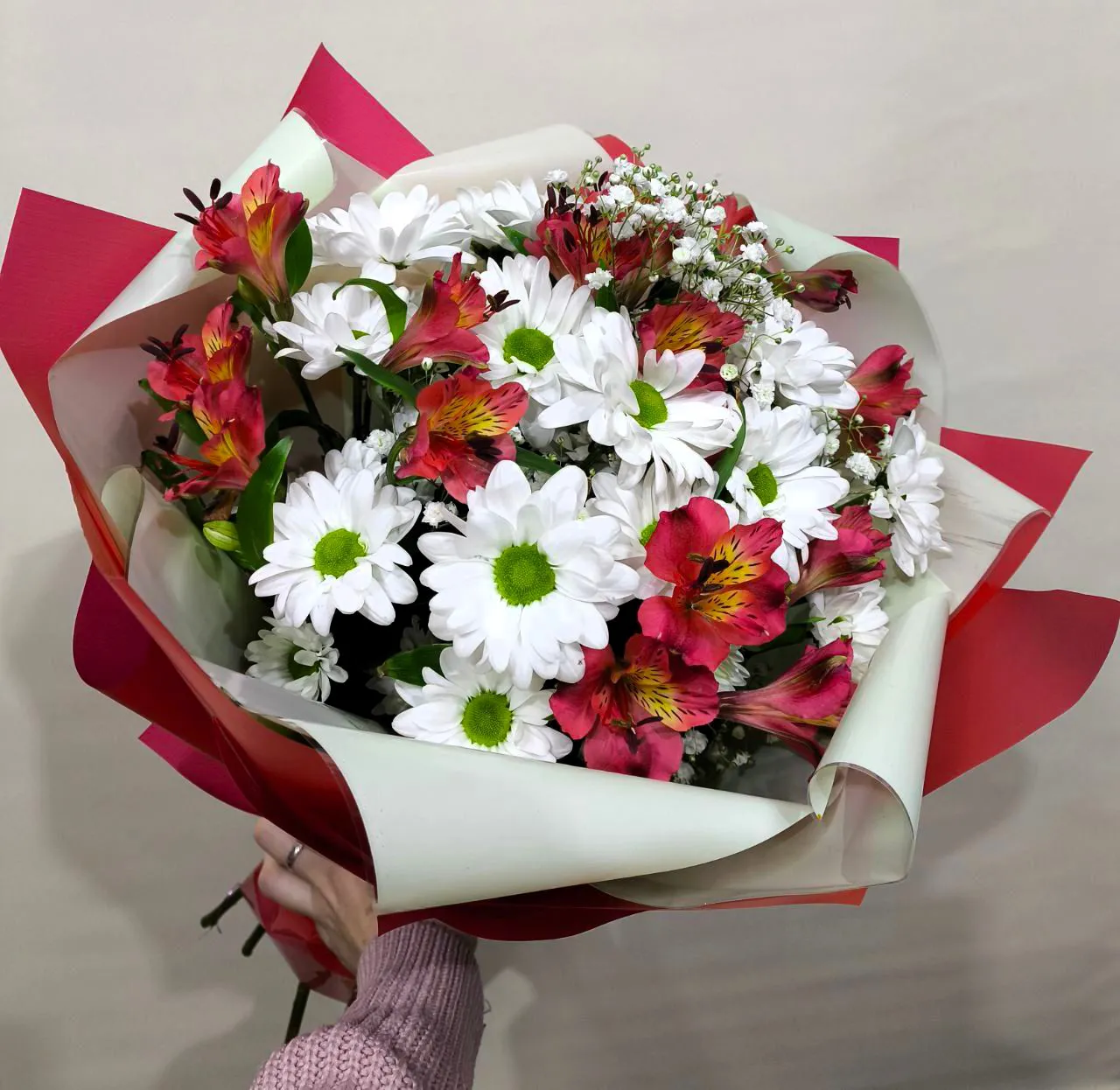 Альстромерии, кустовые хризантемы, упаковка, лента |
