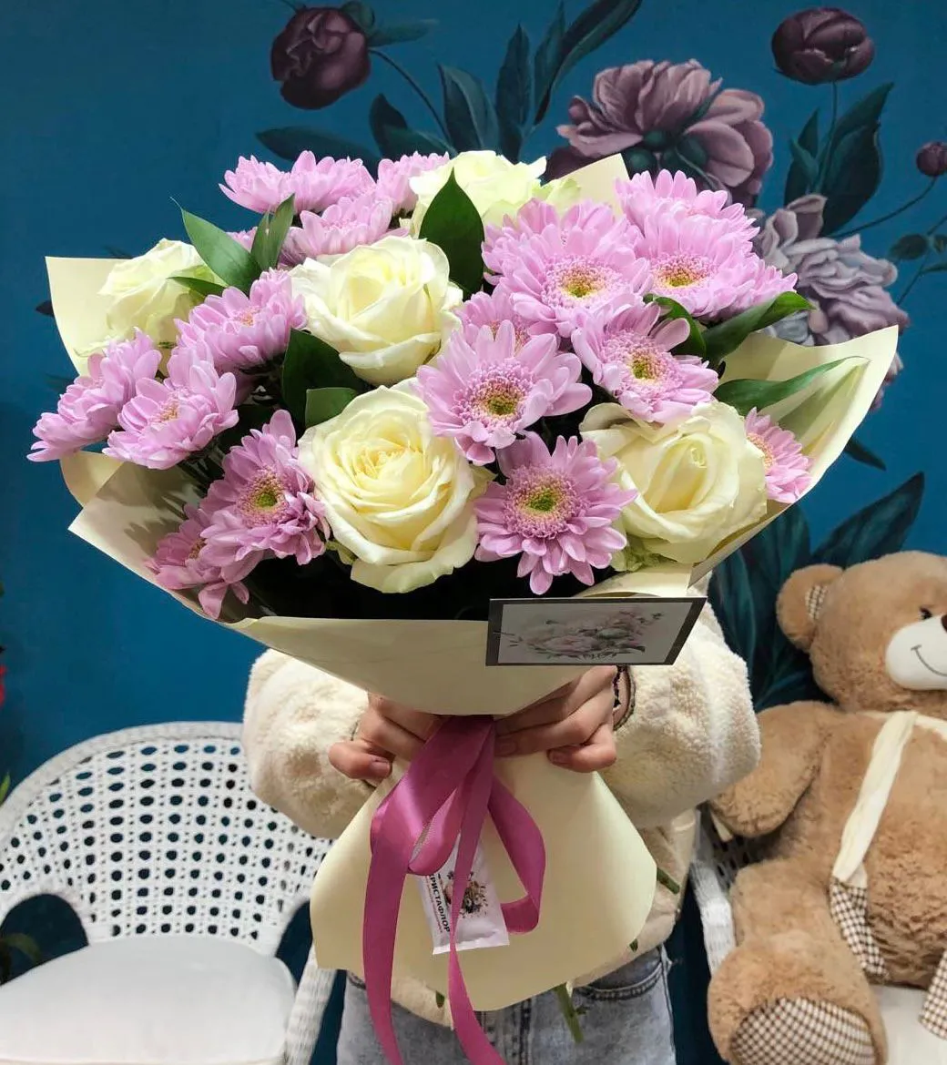 - Средний (Кустовая хризантема 5 шт,, роза 7 шт, зелень, упаковка, лента)