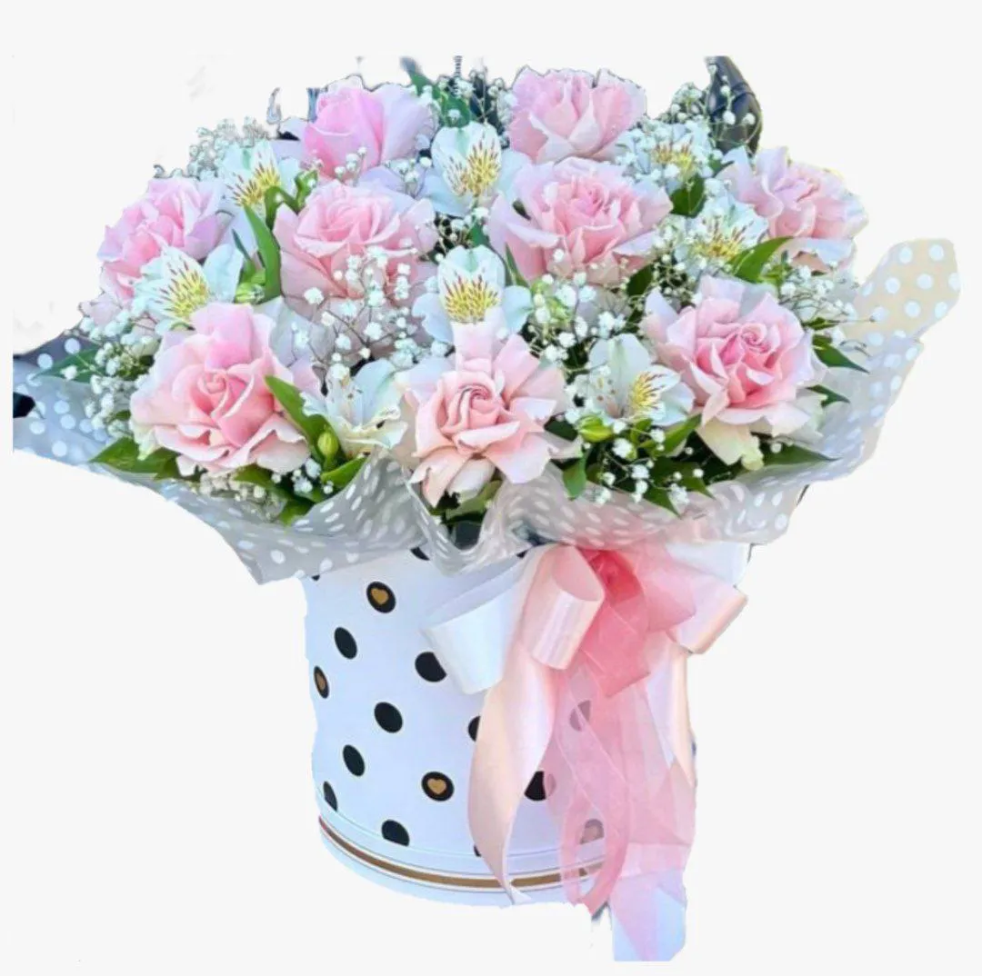 Розы, символизирующие любовь и страсть, задают основное настроение композиции, в то время как альстромерия, изящные цветы с яркой палитрой, добавляют атмосферу радости и vivacity. Легкость гипсофилы подчеркивает нежность a bouquet, делая его ещё более воздушным и романтичным.