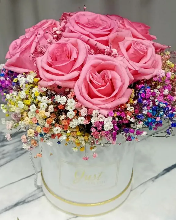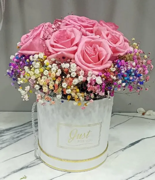 Шляпная коробка, роза, гипсофила |