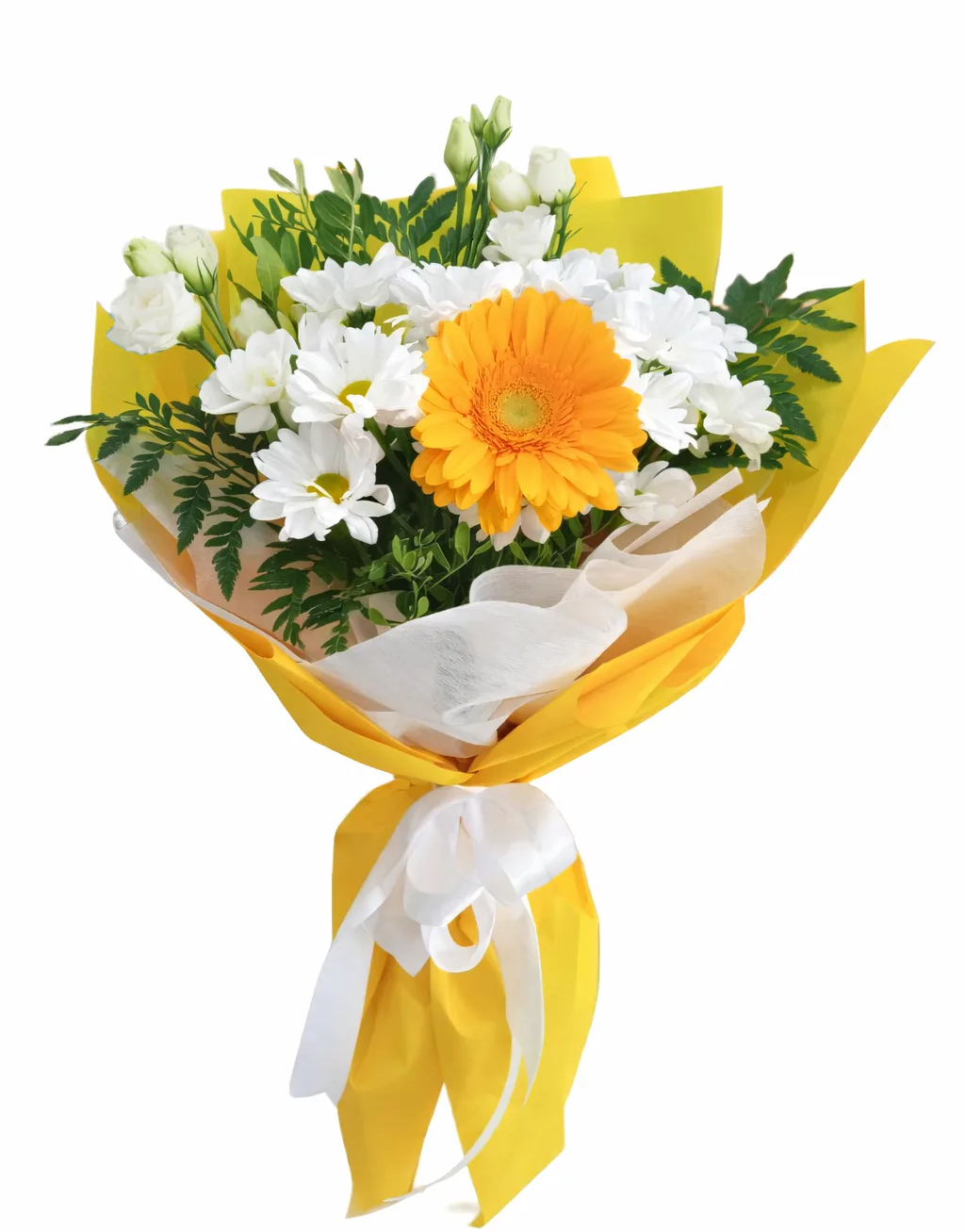 Солнечный и жизнерадостный букет, наполненный светом и позитивной энергией. Яркая жёлтая гербера задаёт настроение и привлекает внимание, ромашковидная хризантема добавляет лёгкость и естественную простоту, а белая махровая эустома придаёт композиции изящество и нежность. Зелень писташ завершает образ свежими акцентами и подчёркивает природную гармонию.