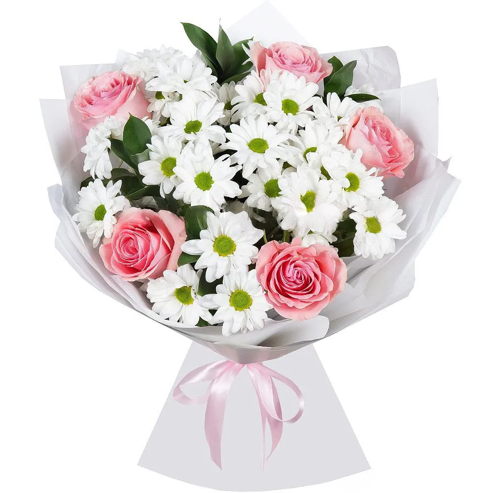 - Стандарт (Кустовая хризантема 4 шт,, роза 5шт, зелень, упаковка, лента)