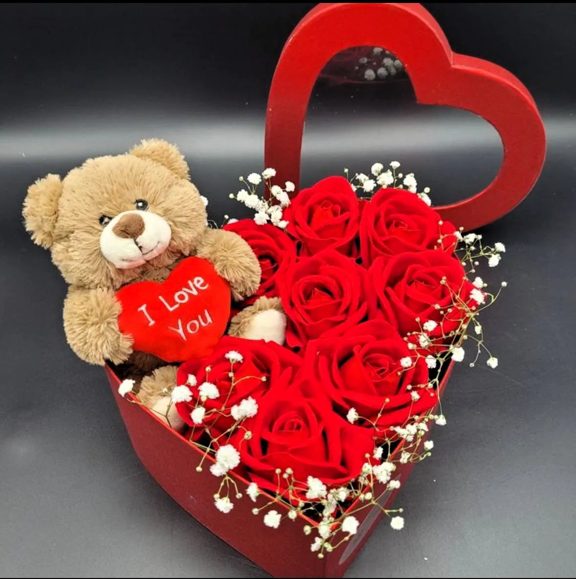 - Стандарт - розы - 9 шт. ,гипсофила, игрушка, топпер, оазис, коробка