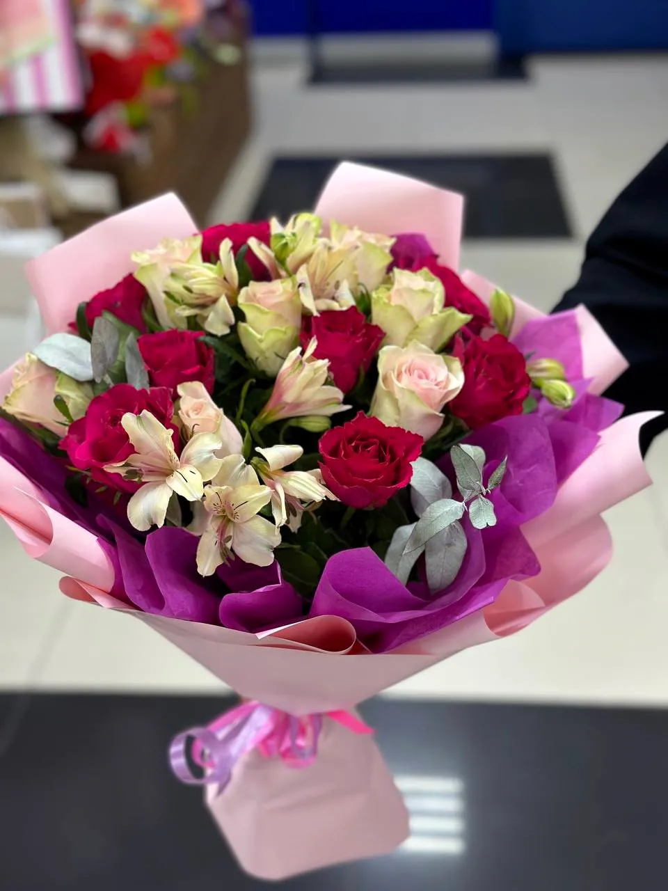Розы,альстромерии,зелень,упаковка,лента |