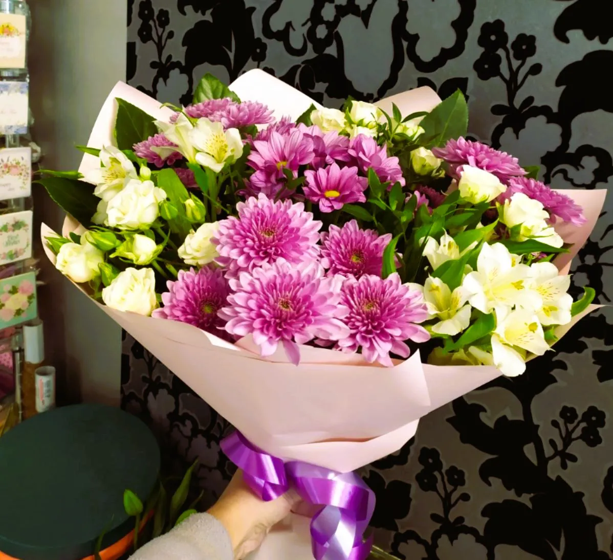 - Стандарт - хризантема кустовая 3 шт., кустовая роза - 2 шт., альстромерия -1 шт., зелень,упаковка,лента